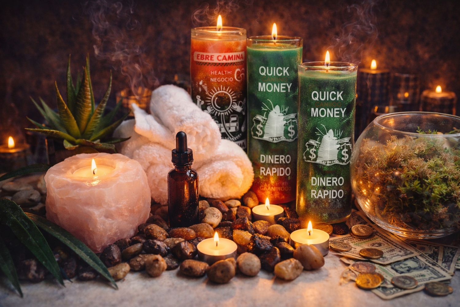 Money Drawing CollectionCandles and ritual tools are prepared to attract financial blessings, prosperity, and success.
