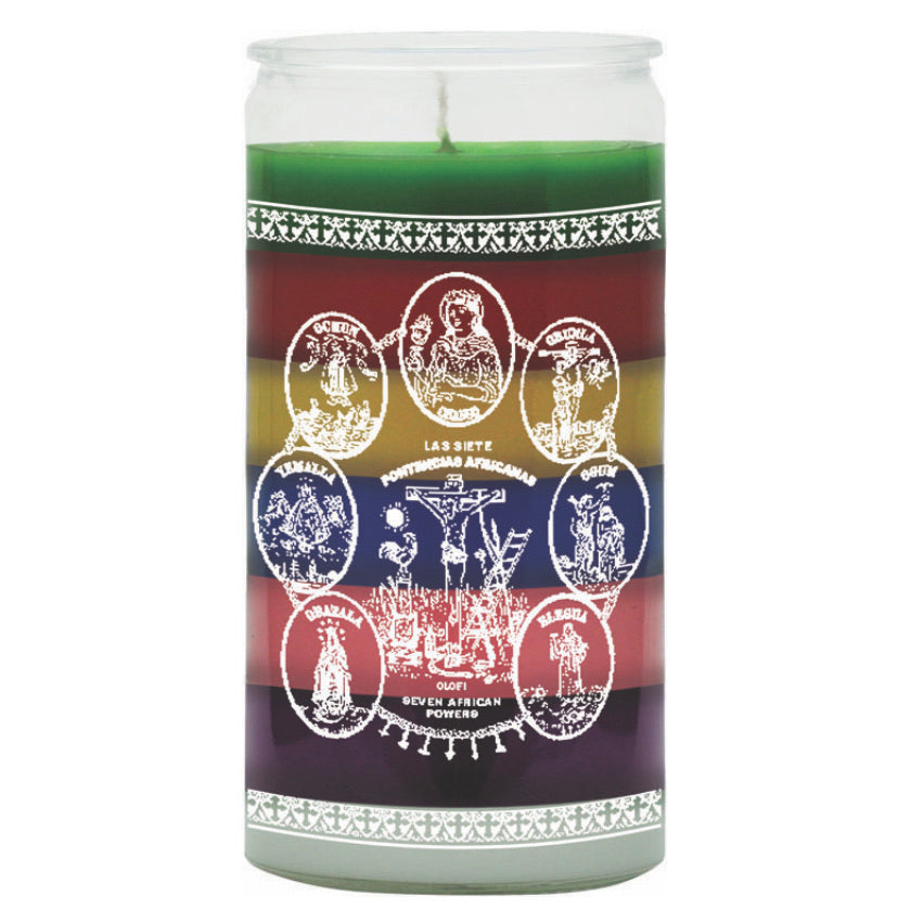 This 14 day candle consists of 7 representative colors: white, purple, lavender, blue, yellow, red and green. As the candle burns through each color, it will bless you and your home with everything necessary for a happy life. It will solve your problems in love and money as well as bless you with good luck, health, protection, power and success. If what you desire is an overall well being and need help in more then one or two aspects of your life, then the 14 day candle of the 7 color African powers is the right choice for you. It will help you cleanse out all the negative powers in your life and replace them with positive energy.