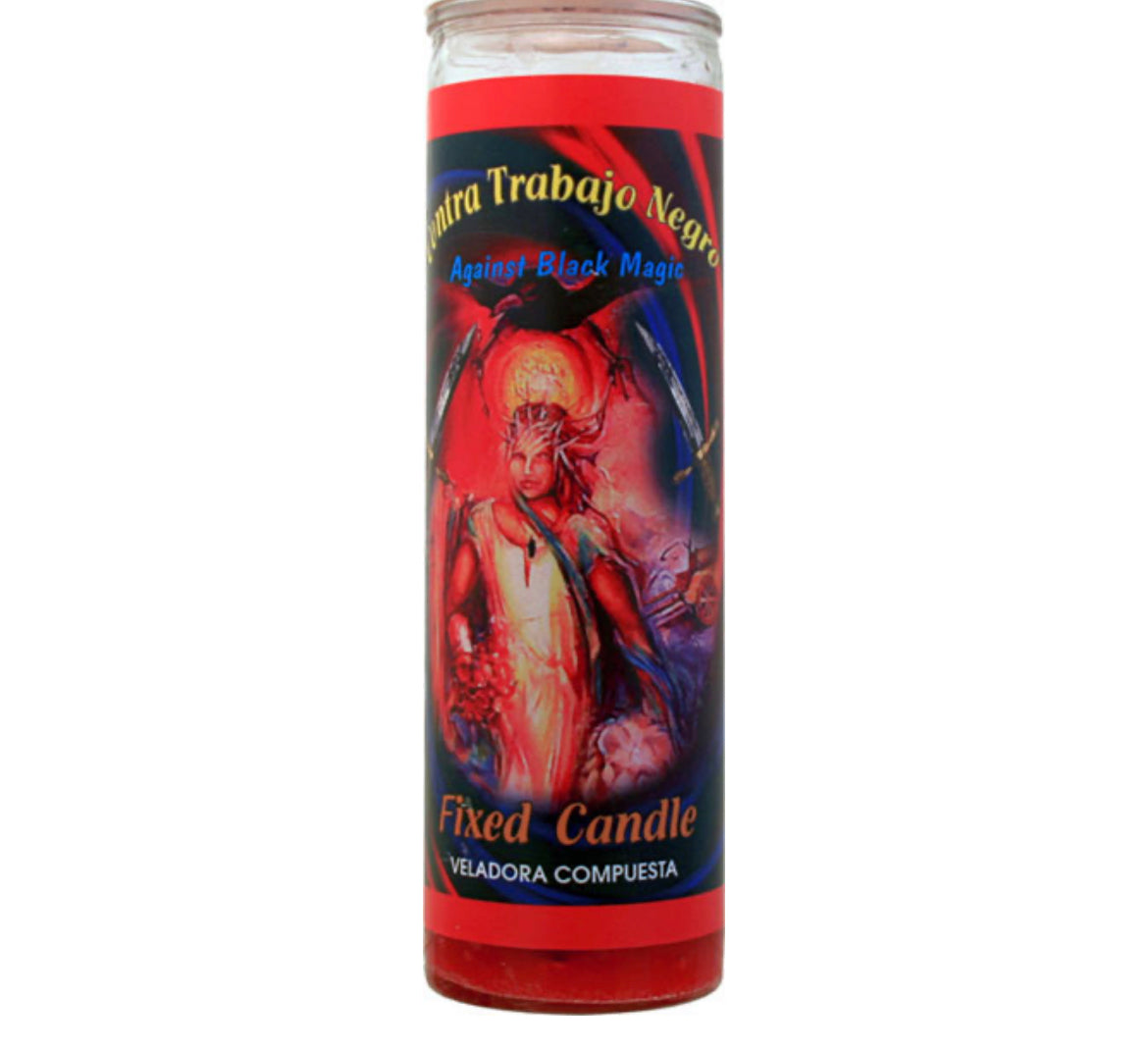 Burn Against Black Magic Fixed Candle to get rid of any spells, magic, evil energy, or hexes placed on you by another. This candle will help to protect you and your home. Candles are prepared with essential oils and their corresponding powders.Candle will burn up to 120 hours. It's dimensions are 2 1/2" wide and 8 1/8" tall.