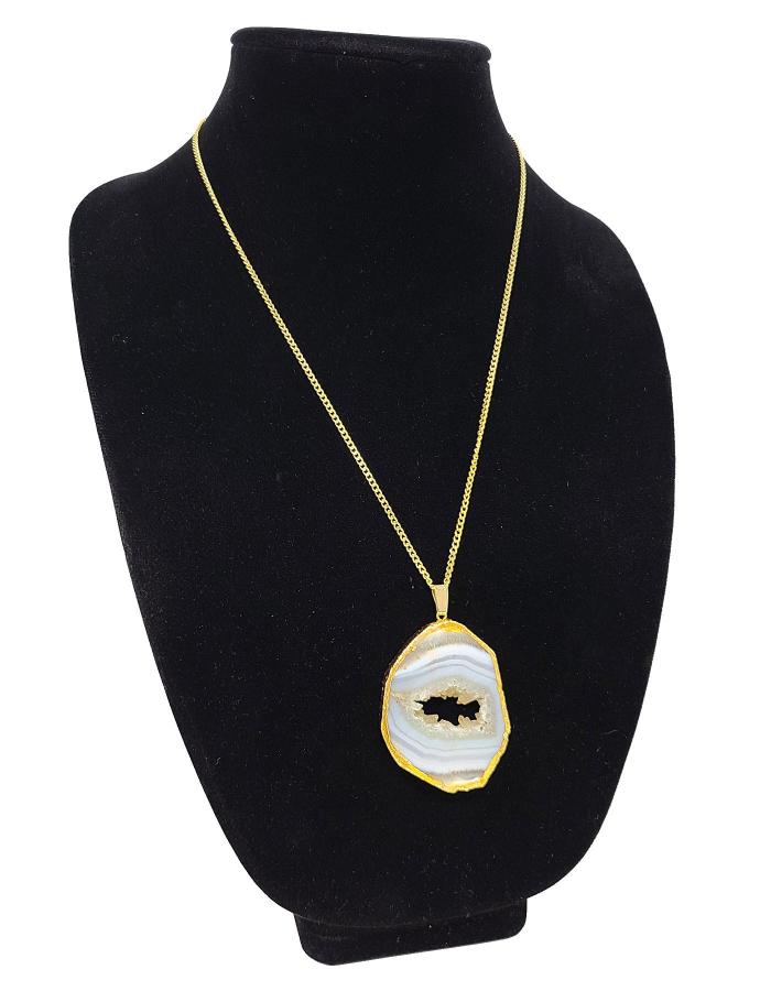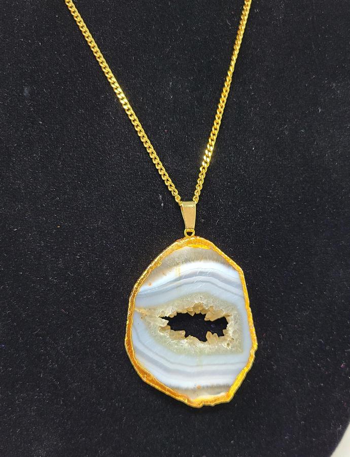 Embrace the raw beauty of nature with this captivating natural GAVA geode electroplated pendant necklace. This unique piece features a stunning geode half, showcasing the mesmerizing formations found within the earth. Each geode is one-of-a-kind, boasting iridescent crystals and captivating textures, making it a true conversation starter.