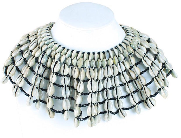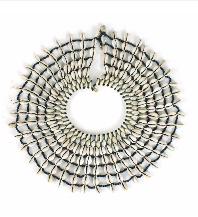 The cowrie shell is an ancient symbol of both spirituality and wealth in Africa. This Kenyan cowrie shell collar necklace is fit for royalty. It is a collar-style necklace made from 5 layers of beautiful and polished cowrie shells.