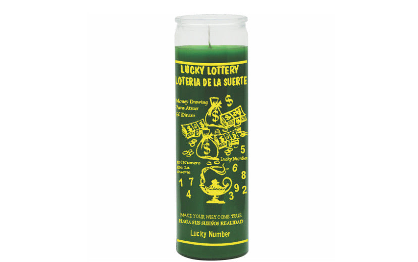 Candle will burn about 120hrs 2 1/2" wide and 8 1/8" tall Place your ticket beneath a 7 day lucky lottery candle and burn on the day the winning numbers are being selected. For added power anoint the candle with a couple drops of Lucky Lottery Oil.