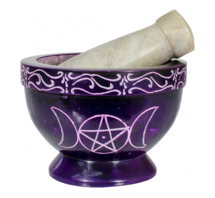 A Mortar and Pestle is a very precious tool used for crushing and grounding food, herbs, seeds and other varieties of herbal and mystical medicines. It is recommended to not use the same mortar and pestle for edible and non edible mixtures. Each set is made from soapstone that has been hand carved, painted and polished. The ancient practice of soapstone carving dates back more than 3000 years. Soapstone or steatite is a natural material. The interior of the mortar and the pestle have not been dyed.