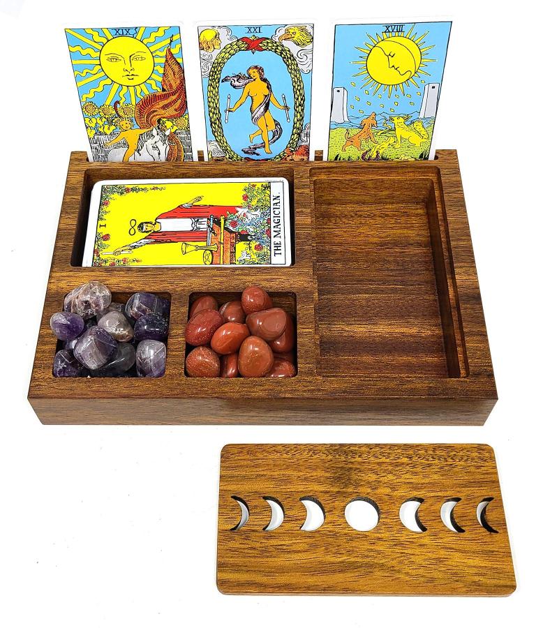 Wooden Tarot Card Holder with Moon Phase Lid Design Storage & Sectionals